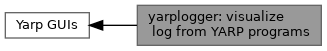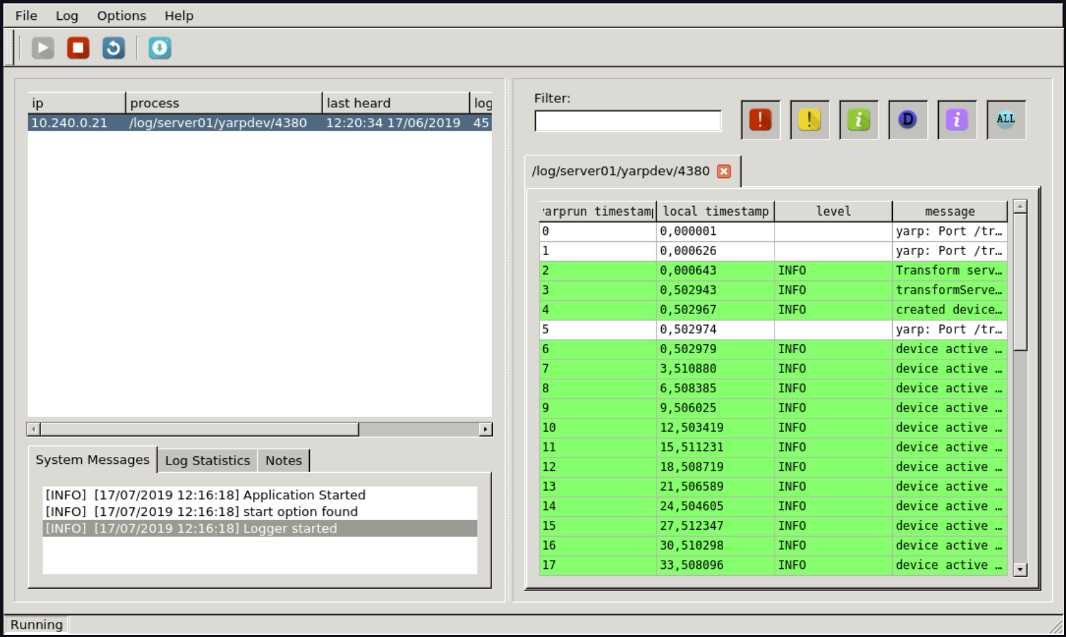 Collaboration diagram for yarplogger: visualize log from YARP programs:A gui to display yarp log messages. The gui consists of two sections: on the left a list of log entries, each of them corresponding to a single process. For each log entry, the pid of the process and the ip address of the machine on which it is running is displayed. The entry becomes yellow/red if one or more warnings/errors are received. For each log entry, the received log messages are displayed on the right windows. It is possible to filter out specific log levels of messages (debug,info,warning,error) by activating the specific filters. It is also possible to type a text and display only the log messages containing that specific text.